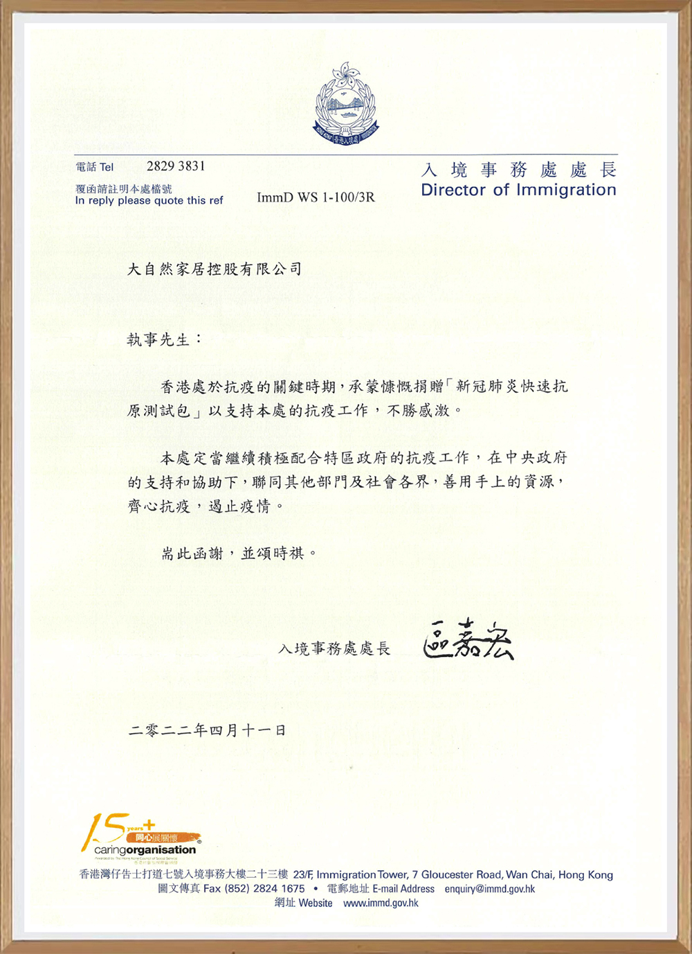 中國香港入境事務處授予大自然家居感謝信