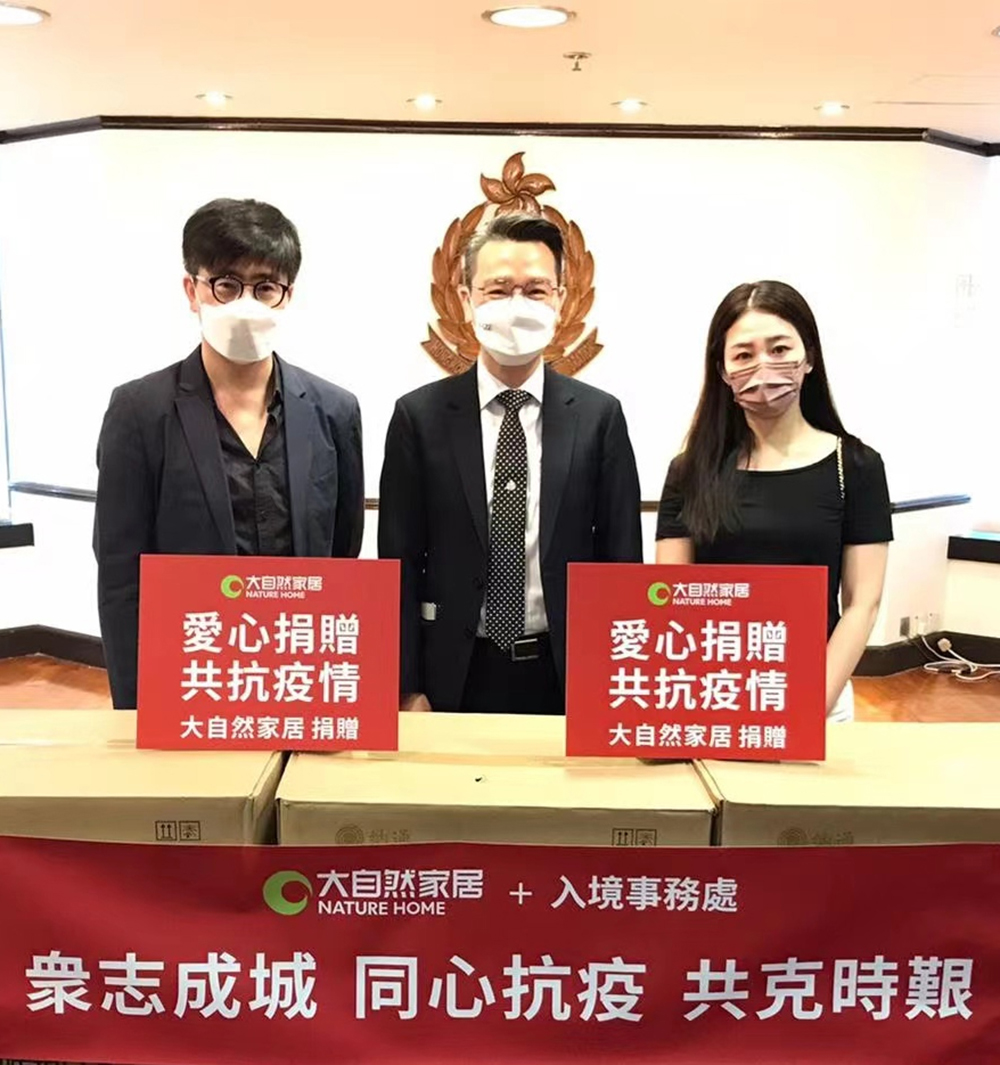 2022年4月11日,大自然家居向中國香港入境事務處和中國香港食環署分別捐贈了一系列疫情防護物質,包括手套、防護口罩、防護面罩、護目鏡、防護衣、快速檢測試劑盒等,緩解疫情當前防控物資緊缺的狀況,以實際行動表達對疫情防控工作的支持,踐行社會責任,助力打贏疫情防控“攻堅戰”。