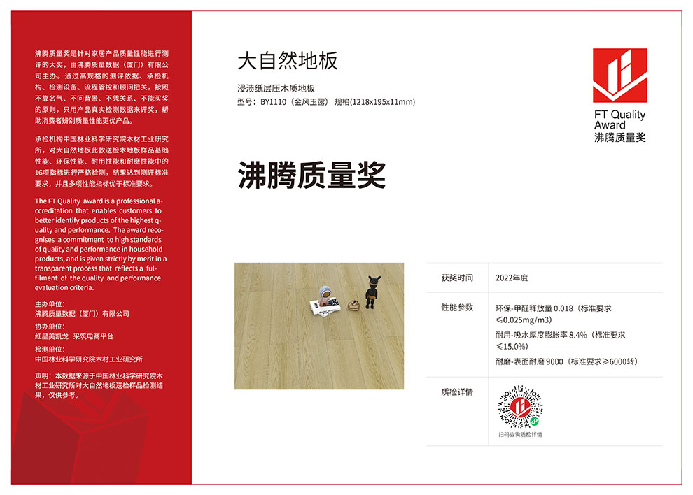 “設(shè)計(jì)看紅點(diǎn)獎(jiǎng),質(zhì)量看沸騰獎(jiǎng)”!2022年7月9日,掌握2大核心科技的大自然家居蟬聯(lián)“沸騰質(zhì)量獎(jiǎng)”,其獲獎(jiǎng)產(chǎn)品金風(fēng)玉露(型號(hào):BY1110)融合了“零醛智造”和“防水科技”,16項(xiàng)性能指標(biāo)遠(yuǎn)遠(yuǎn)優(yōu)于國(guó)家標(biāo)準(zhǔn)。這是繼去年大自然家居實(shí)木地板二翅豆(型號(hào):D1348P)獲獎(jiǎng)后,該公司再次獲得該大獎(jiǎng)。