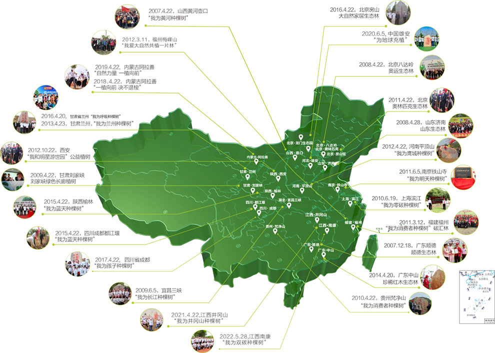 一、實施“中國綠色版圖”工程。從2006年開始,該集團與中國綠化基金會合作,已連續2次簽訂共計2000萬的合作協議,數年來已累計向中國綠化基金會捐資超過1500萬元,每年開展植樹活動,至今已在國內外19個地區種植了27片生態林,植樹超80萬棵,種植面積超102萬m²。即使在近幾年的疫情期間,也沒有中斷過。